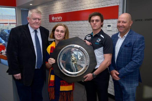 The Adelaide Football Club and Port Adelaide Football Club together with Variety – the Children’s Charity of South Australia have unveiled the new Variety Showdown Shield. The shield is a striking design with a large, dark wood frame and a silver plate with the distinct logos of all three organisations.